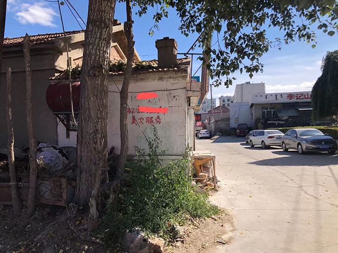10月上旬,澎湃新闻实地探访林东镇。王岭曾经营的慢时光休闲吧位于该镇三道街一处店面的二楼,这里是林东镇老城区,周边建筑陈旧低矮,多处建筑外墙上喷涂有“找小姐”“美女过夜”等字样。