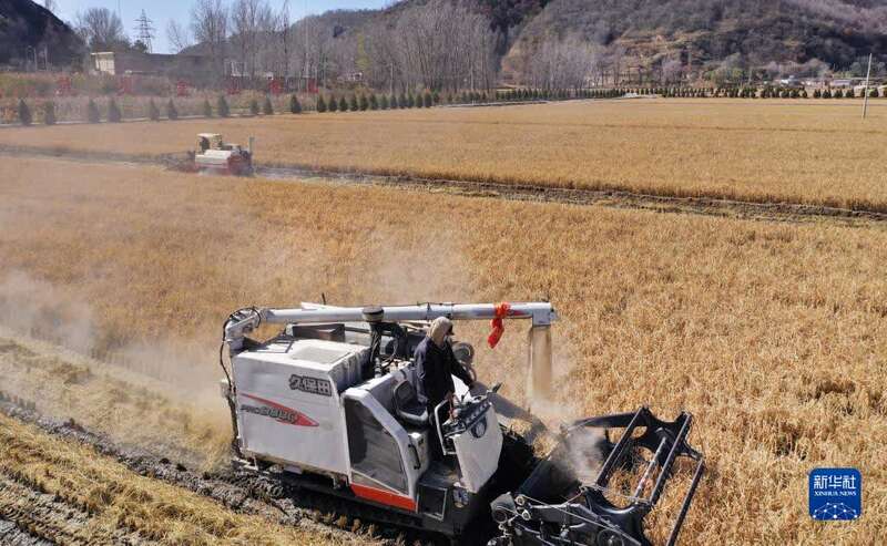 收割机在延安市南泥湾镇收割水稻(2020年10月23日摄,无人机照片)。新华社记者 陶明 摄