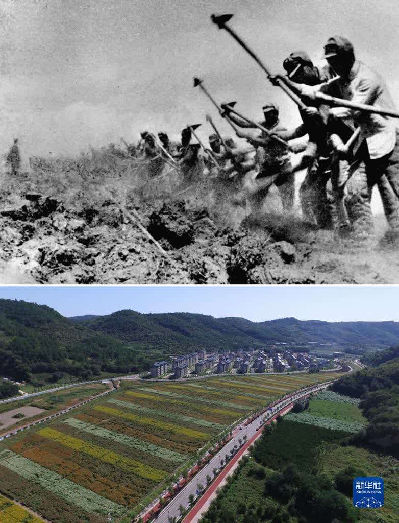 这是一张拼版照片,上图为:抗日战争期间,八路军三五九旅在南泥湾开荒生产(资料照片);下图为:2020年8月25日拍摄的延安南泥湾景色(无人机照片,祁小军摄)。新华社发