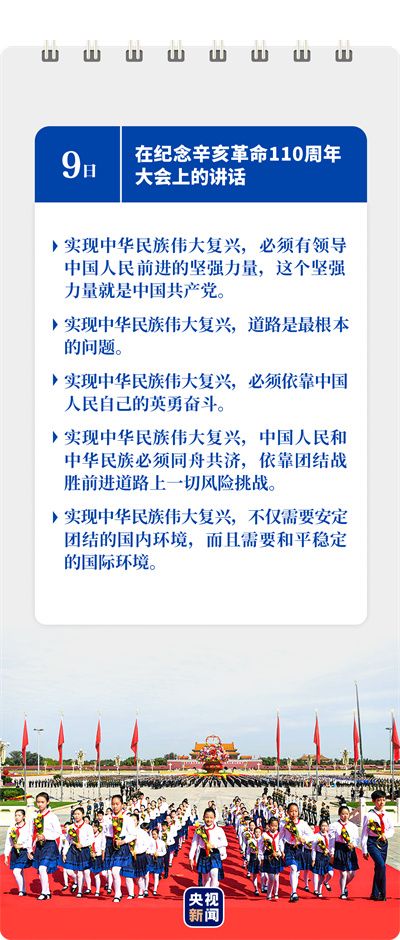 在10月9日的纪念大会上,习近平总结了辛亥革命110年来的5点历史启示——