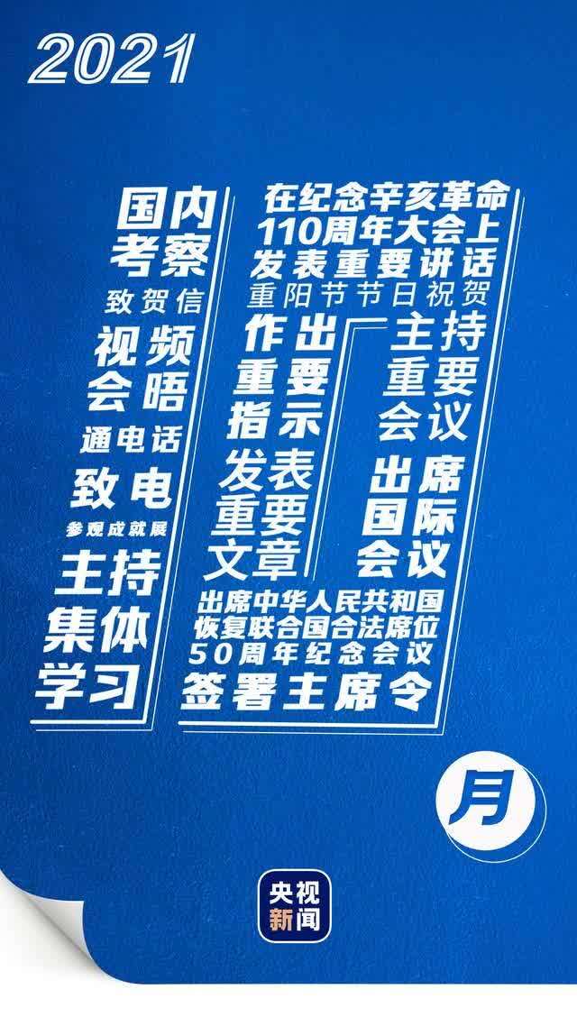 在纪念辛亥革命110周年大会上,高度评价辛亥革命的历史功勋,呼吁海内外全体中华儿女携手向着民族复兴的目标继续奋勇前进;来到黄河入海口,部署推进黄河流域生态保护和高质量发展的国家战略;参观国家“十三五”科技创新成就展 ,对广大科技工作者提出殷切期盼;开展多次“云外交”,阐明中国主张……习近平高瞻远瞩,话语铿锵。