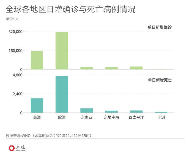 11月10日,欧洲单日新增确诊病例突破了30万,是其他地区的两倍之多,而单日新增死亡人数也接近美洲的2.5倍。
