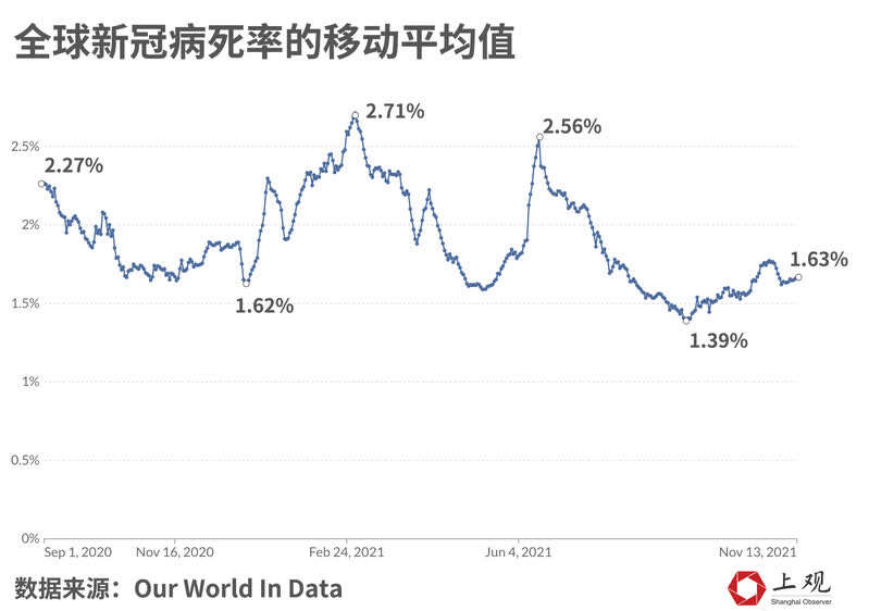根据约翰·霍普金斯大学的计算,全球新冠病死率目前也处于低谷状态,11月14日全球病死率的移动平均值为1.63%,比年初的最高值下降了1.08%。