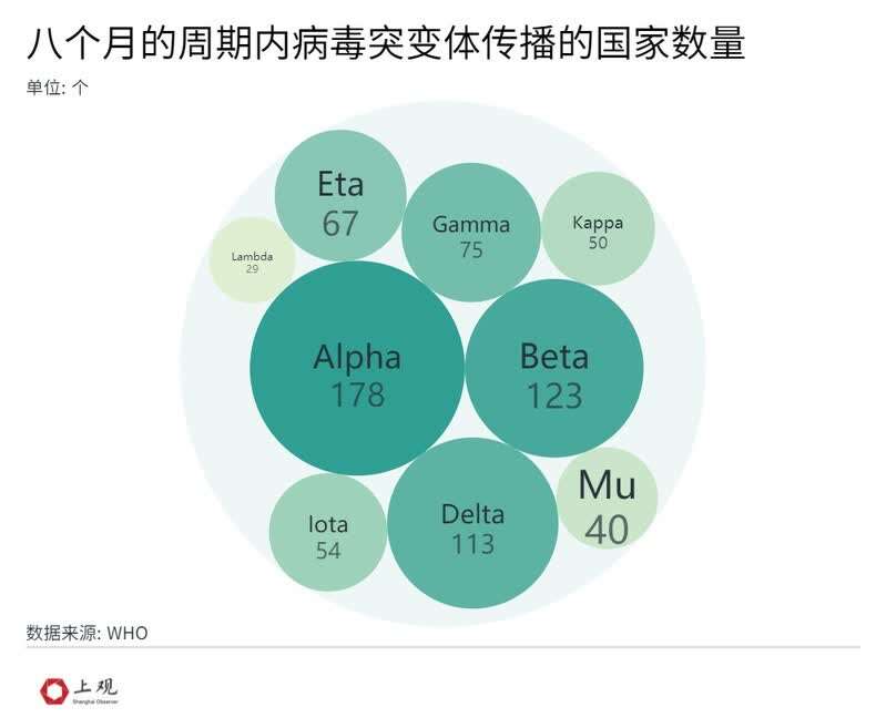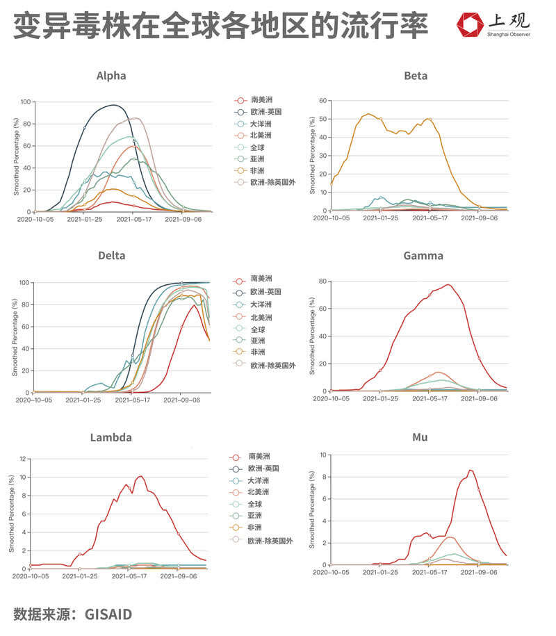 根据全球共享流感数据倡议组织(GIASID)的数据,毒性较低的Alpha与Delta是扩散最广的两大变异毒株。Alpha是2021年上半全球最主流的变异毒株,其中欧洲的占比最大;而在5月份后,毒性更低的Delta取代Alpha的位置,在全球五大洲肆意扩散,这也可能是死亡率下降的因素之一。