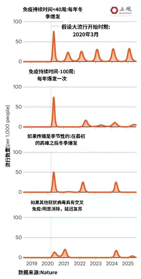 根据哈佛流行病学家Marc Lipsitch及其团队去年发表的研究,在接下来的两年时间内,疫情活动将依旧显著,但没有清晰的波型,并且未来的发展态势将取决于疫苗所提供的免疫效果。