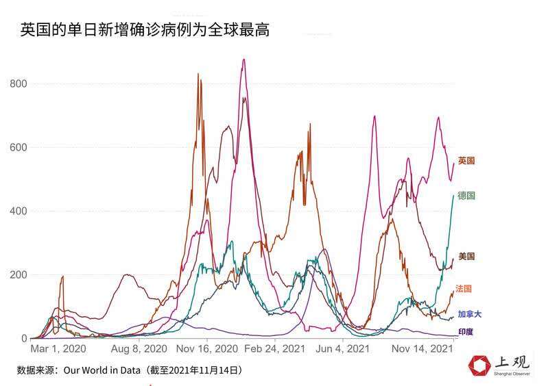 据Our World in Data统计,截至11月14日,英国的单日新增确诊病例超过了3.6万例,居于全球首位。而德、法的日增也均在1万人以上。
