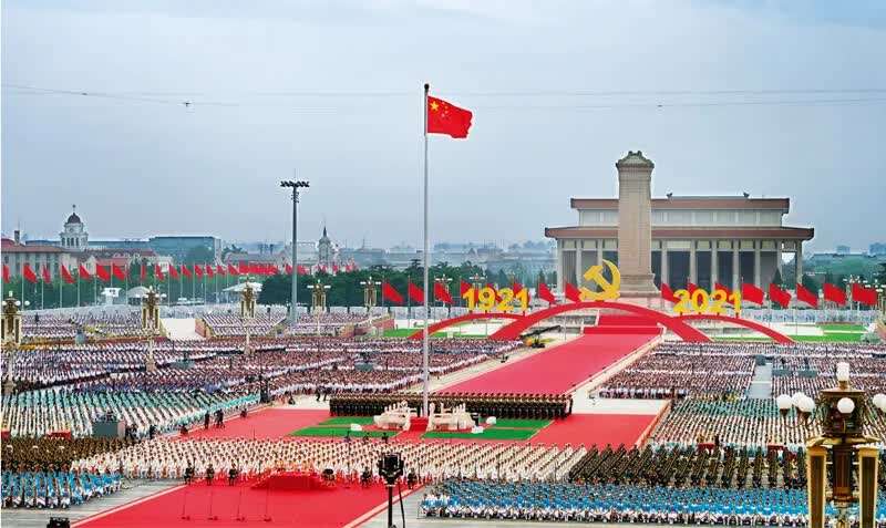 2021年7月1日上午,庆祝中国共产党成立100周年大会在北京天安门广场隆重举行。习近平总书记在大会上庄严宣告,我们实现了全面建成小康社会的第一个百年奋斗目标。图为庆祝大会现场。 李舸/摄
