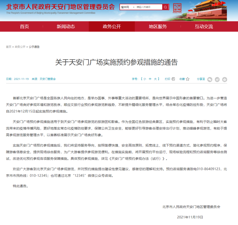 11月19日,北京市人民政府天安门地区管理委员会发布通告称,为进一步营造良好参观环境和游览秩序,结合常态化疫情防控形势,天安门广场将自12月15日起实施预约参观措施。