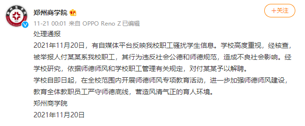 针对此前网传郑州商学院一教师言语骚扰女学生的情况,郑州商学院今天凌晨在其官方微博发布处理通报。全文如下: