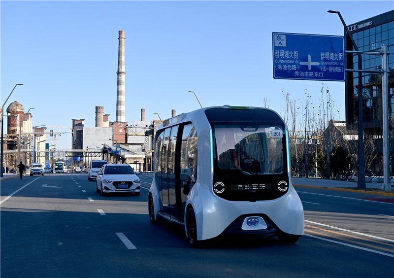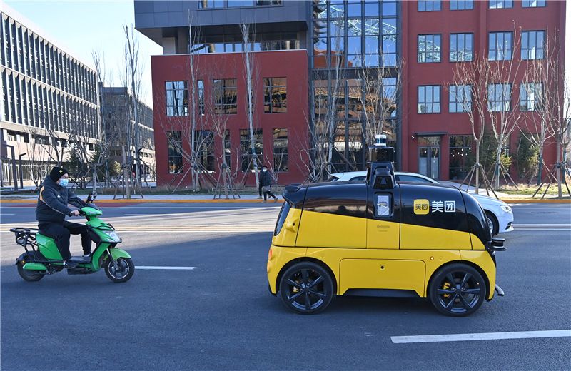 2021年12月1日,位于北京市石景山区的首钢园内,无人驾驶外卖送货车、燃油汽车、骑电动车的市民有序行进。2021年5月1日起,首钢园内的无人驾驶出租车、小巴士、无人驾驶送货车等已面向公众开启常态化运营。 中新社记者 侯宇 摄
