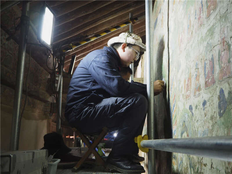 2021年4月27日,壁画修复师在位于青海省海东市的瞿昙寺修复壁画。新华社记者 白玛央措 摄