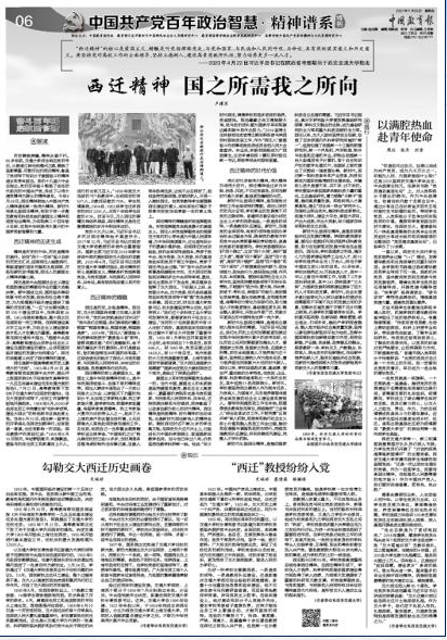 2021年11月25日,《中国教育报》刊发中国共产党百年政治智慧·精神谱系特刊,整版聚焦中国共产党人的精神谱系——西迁精神。