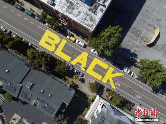 资料图:当地时间2020年6月13日,美国旧金山市政厅附近的街面上,出现用黄油漆涂写的巨幅“Black Lives Matter”(黑人的命也是命)字样。 中新社记者 刘关关 摄