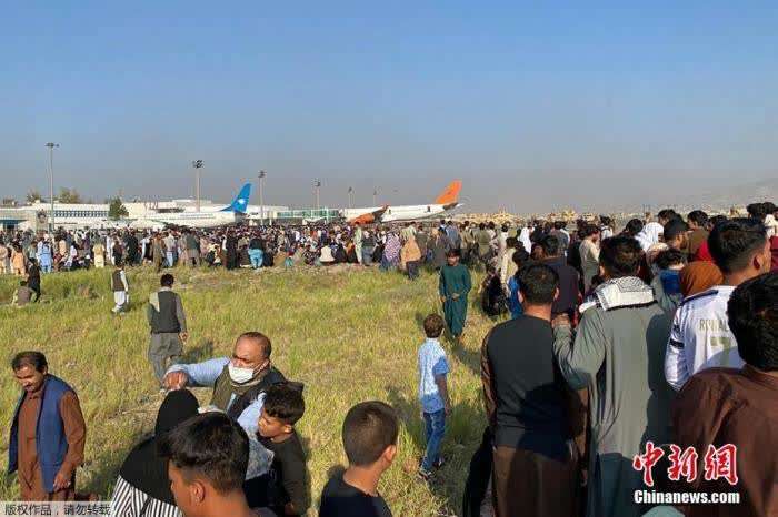 资料图:当地时间8月16日,等待撤离的人群聚集在阿富汗机场。据俄罗斯卫星通讯社报道,美军当天曾在喀布尔机场朝部分阿富汗人开枪,造成至少3人死亡。