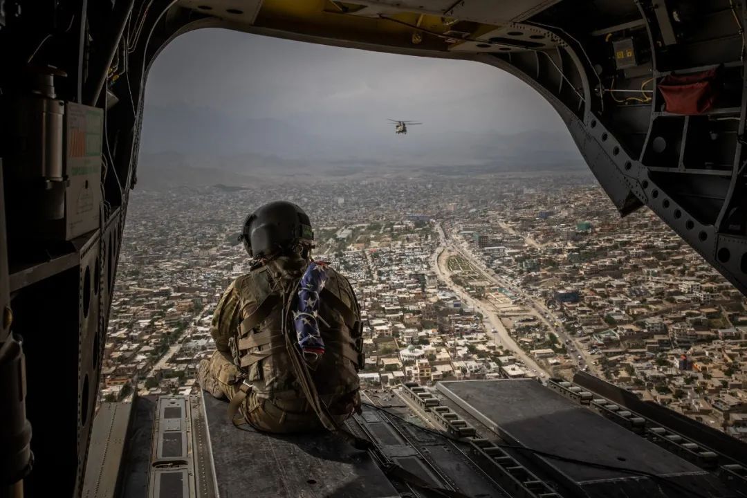 5月2日,阿富汗喀布尔,一名美国士兵坐在一架“支奴干”运输直升机上,此时美军开始从阿富汗撤离,在坎大哈机场装载弹药和补给。Jim Huylebroek为《纽约时报》报道