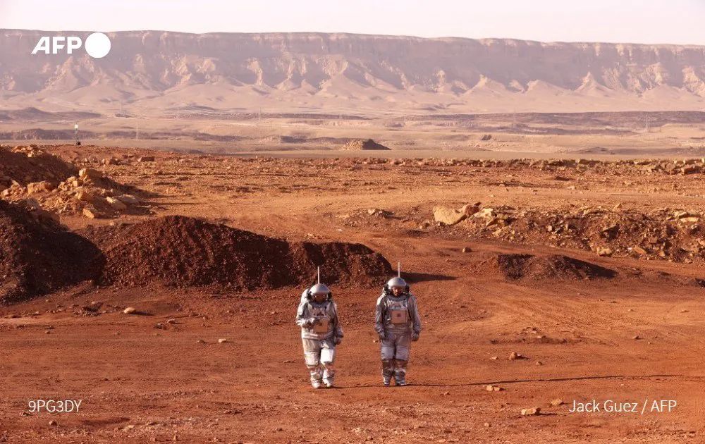 10月10日,以色列南部内盖夫沙漠米兹佩拉蒙,拉蒙坑模拟基地,两名来自欧洲和以色列团队的宇航员,穿着宇航服为火星任务进行模拟训练。Jack Guez/法新社