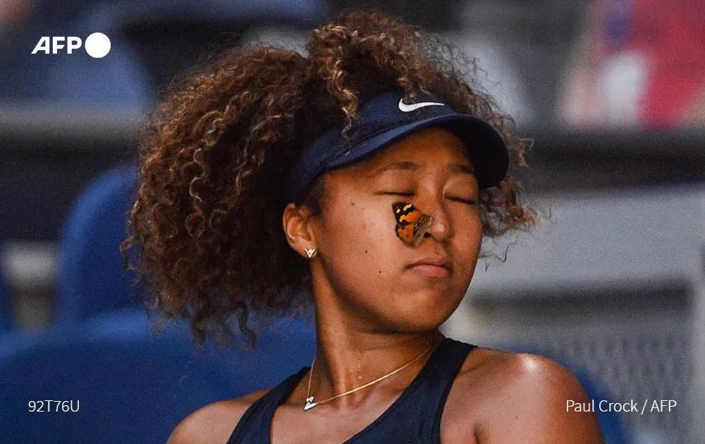 2月12日,澳大利亚墨尔本,在澳大利亚网球公开赛女子单打比赛第五个比赛日中,一只蝴蝶落在日本选手大阪直美脸上。她在比赛中对阵突尼斯选手阿纳斯·贾巴尔。Paul Crock/法新社