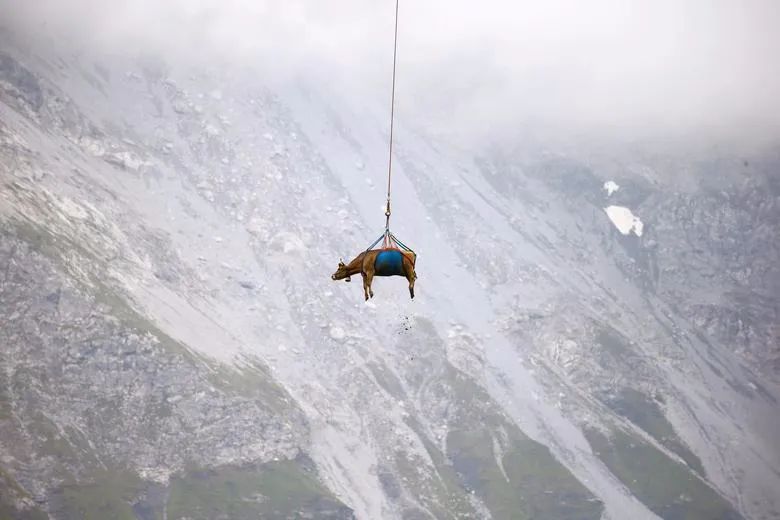 8月27日,一头奶牛在瑞士克劳森帕斯附近的高山牧场度过夏季后,被直升机吊起“飞”下山。And Wiegmann/路透社