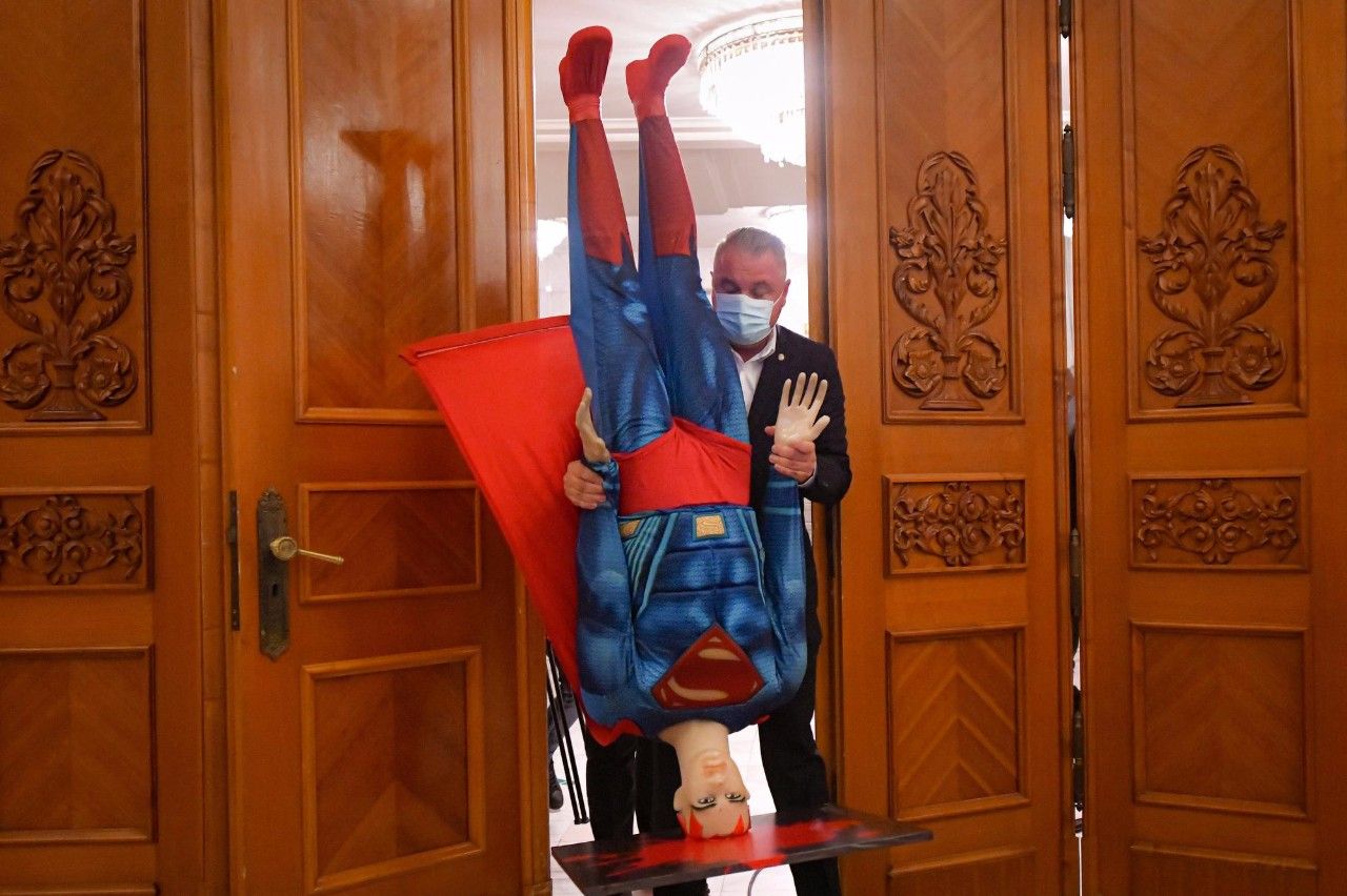 10月5日,罗马尼亚首都布加勒斯特,罗马尼亚议会对总理弗洛林·西图政府进行不信任投票之前,一名男子抱着一个装扮成超人形象的人体模特。Andreea Alexandru/美联社