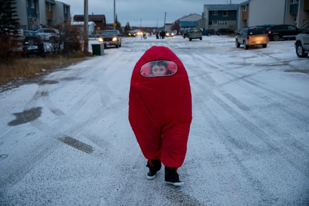 10月31日,加拿大丘吉尔镇,一名儿童在万圣节晚上外出“冒险”。在这里,北极熊袭击是一种真实存在的危险,所以镇上的居民开车跟在孩子后面保护他们。Damon Winter/《纽约时报》