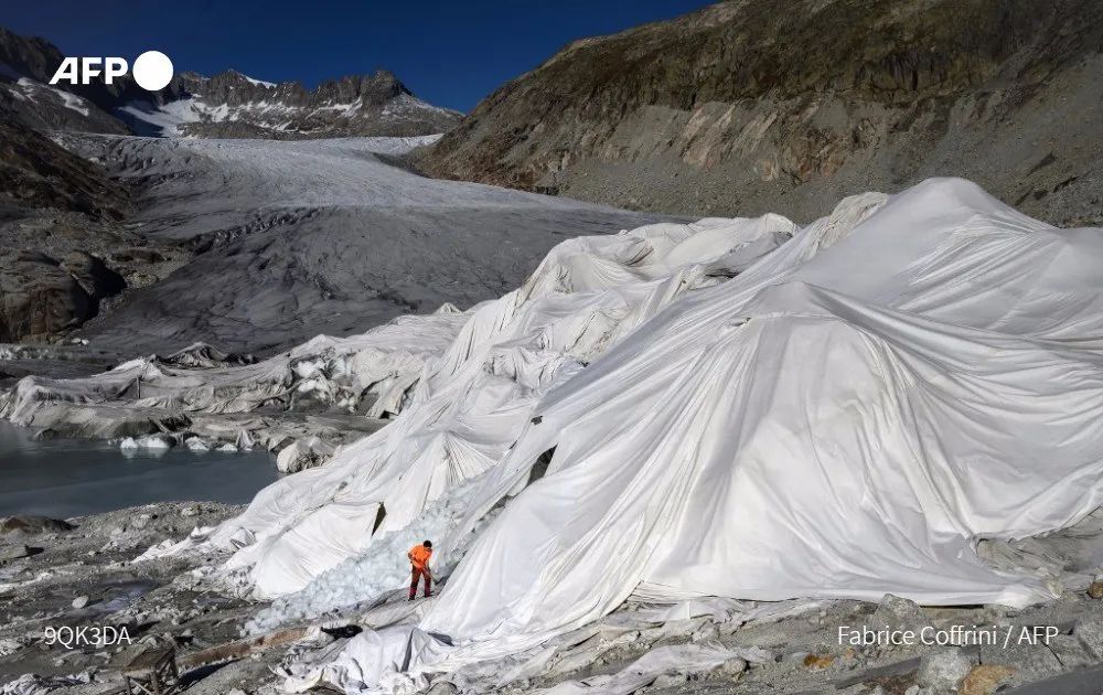 10月27日,瑞士格莱奇附近,一名男子在罗讷冰川上工作。为防止因全球变暖而融化,该冰川部分覆盖隔热的泡沫塑料。Fabrice Coffrini/法新社