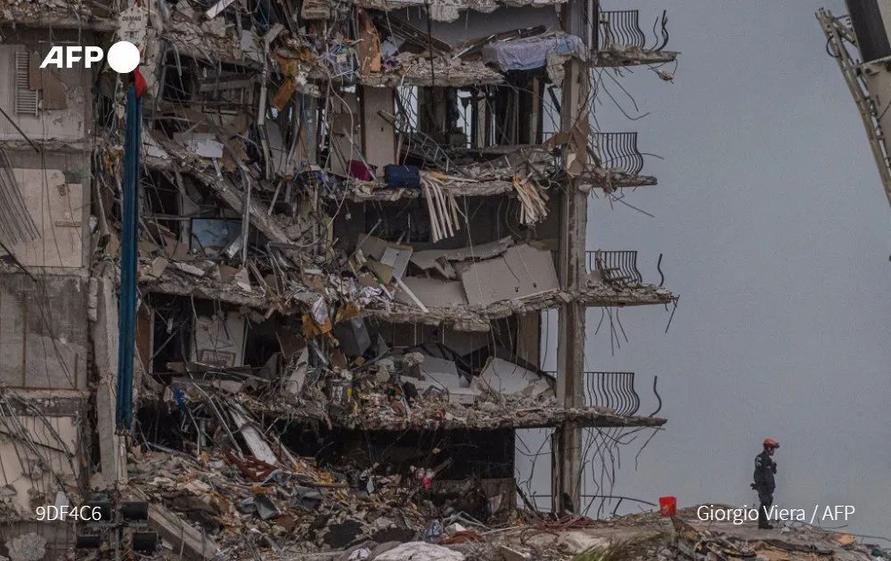 6月28日,美国佛罗里达州,搜救队在部分坍塌的12层建筑尚普兰南塔楼海滨公寓南楼的废墟中寻找可能的幸存者。Giorgio Viera/法新社