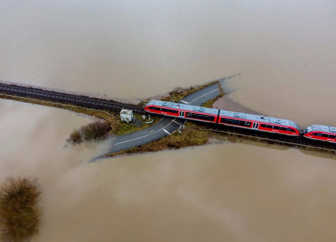 2月3日,德国法兰克福附近的尼德劳市,一列火车驶过被洪水淹没的铁路道口。Michael Probst/美联社