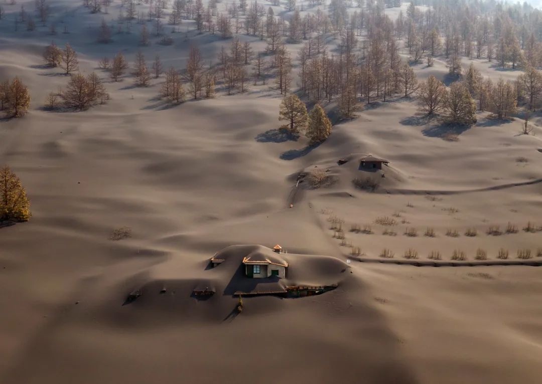9月19日,西班牙加那利群岛,Cumbre Vieja火山半个世纪以来第一次喷发。到11月中旬,熔岩已经席卷了2500英亩(1000公顷)的土地,火山灰覆盖了拉帕尔马岛十分之一的地区,包括10月30日在疏散区看到的这些房屋。Emilio Morenatti/美联社