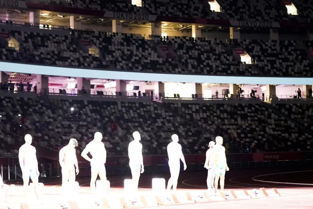 这张曝光过度的照片显示,8月1日,东京奥运会男子100米决赛开始前,运动员们在做准备。他们背后是体育馆内的空座位。Jae C. Hong/美联社