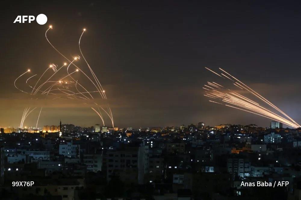 5月14日夜间,在加沙地带上空,以色列铁穹导弹防御系统(左)拦截哈马斯从加沙地带北部贝特拉希亚向以色列南部发射的火箭(右)。Anas Baba/法新社