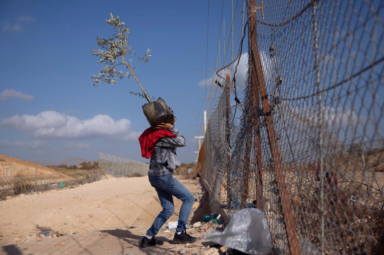 3月8日,约旦河西岸城市希伯仑,一名巴勒斯坦男子带着一棵橄榄树试图从隔离墙的缺口非法进入以色列。Oded Balilty/美联社