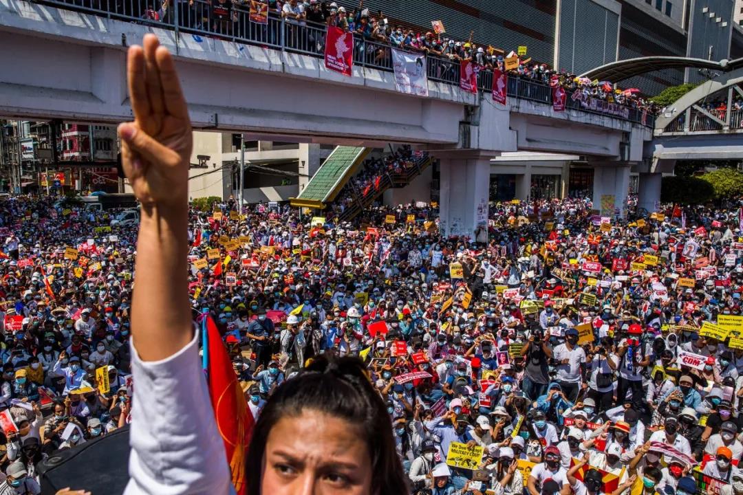 2月17日,缅甸仰光,反对军事政变的抗议人数在几天之内扩大到数十万。在一次集会上,女演员彭菲图(Paing Phyoe Thu)举起了三个手指敬礼,这个手势来自系列电影《饥饿游戏》。《纽约时报》
