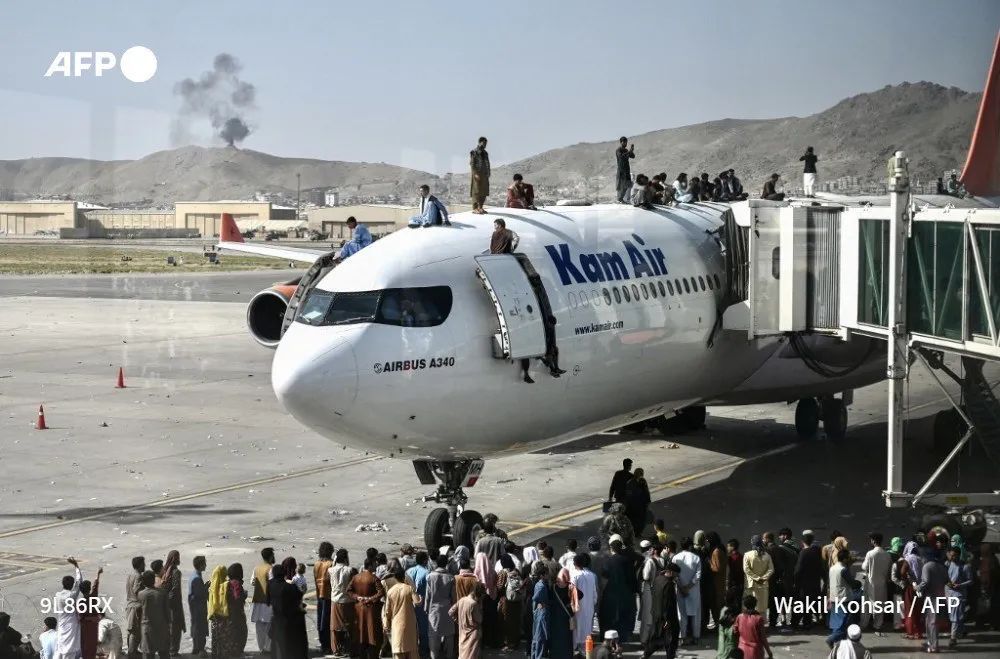 8月16日,阿富汗喀布尔市,阿富汗民众在喀布尔机场等候时爬上飞机顶部。持续了20年的阿富汗战争以惊人的速度结束后,数千人包围了这座城市的机场,试图逃离伊斯兰主义者强硬的恐怖统治。Wakil Kohsar/法新社