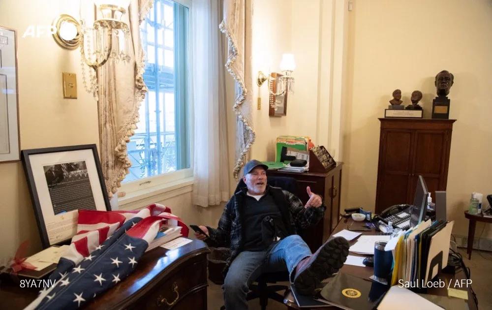 1月6日,美国华盛顿国会大厦内,美国总统唐纳德·特朗普的支持者理查德·巴内特坐进了美国国会众议院议长南希·佩洛西的办公室,进行抗议。Saul Loeb/法新社