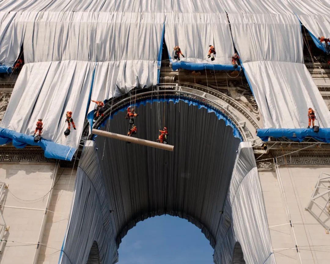 9月15日,法国巴黎,工人们在凯旋门上铺开银色织物,为“包裹的凯旋门”艺术装置作品做准备。这是艺术家克里斯托(Christo)生前构想的一件作品,在他去世一年后得到实现。Elliott Verdier为《纽约时报》报道