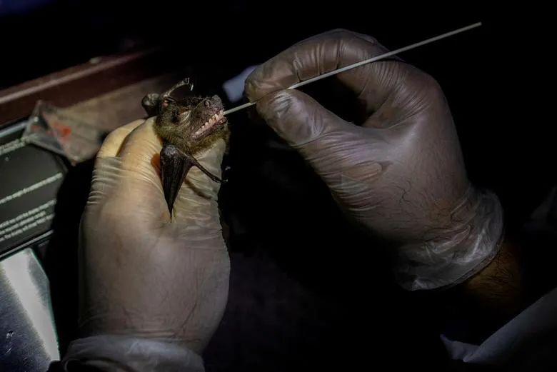 2月19日,菲律宾拉古纳省洛斯巴诺斯市的菲律宾大学洛斯巴诺斯分校,一名蝙蝠生态学家正在取样一只蝙蝠的口腔拭子。Eloisa Lopez/路透社