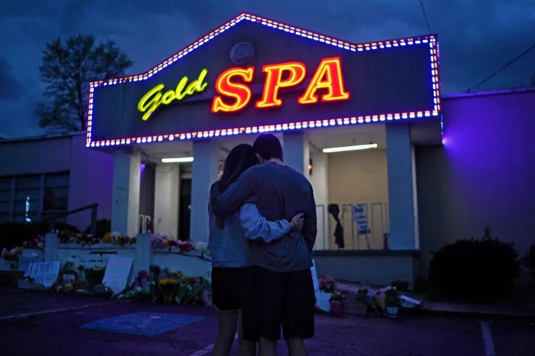 3月18日,美国亚特兰大,辛西娅·施(Cynthia Shi)在黄金水疗馆(Gold Spa)门外拥抱男友格雷厄姆·布卢姆史密斯(Graham Bloomsmith)。一名枪手在3家按摩店杀害8人,黄金水疗馆是案发地之一。其中6名受害者是亚裔,这在美国的亚裔群体中引发了恐慌。Chang W. Lee/《纽约时报》