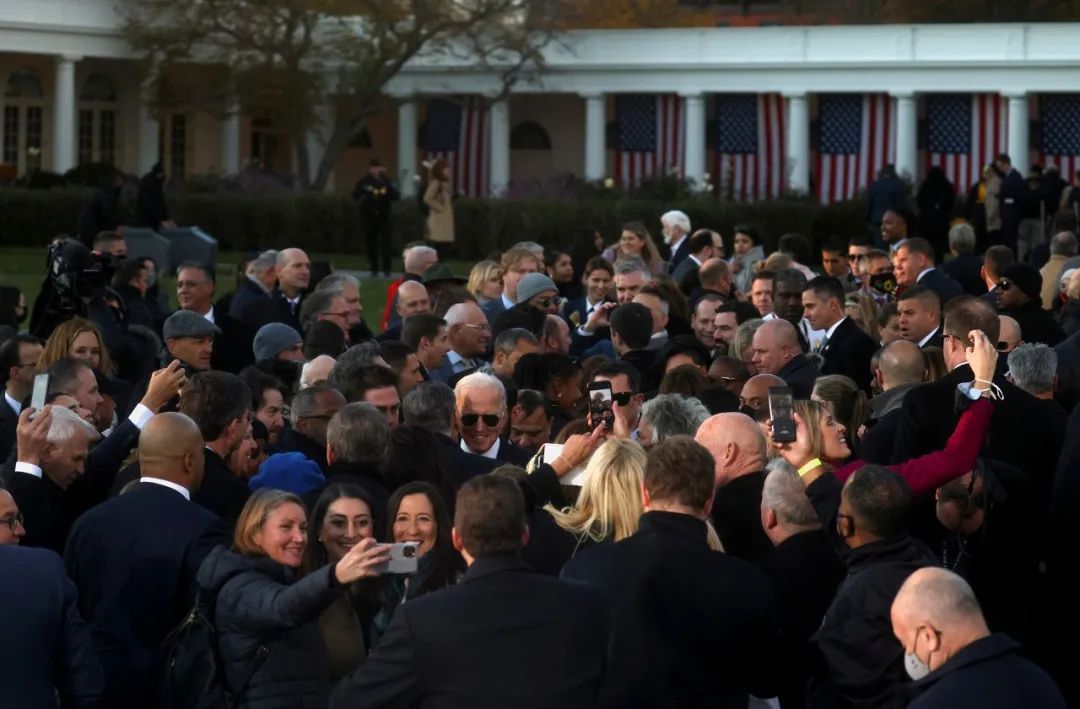 11月15日,在美国总统拜登签署约1万亿美元的基础设施投资法案后,国会议员、市长、工会工人、部落领袖和民权活动人士聚集在白宫南草坪。这份两党协议包括用1100亿美元建设道路和桥梁,660亿美元用于铁路,550亿美元用于清洁饮用水和更换水管。拜登称它“证明了尽管有愤世嫉俗的人,民主党和共和党人仍可以走到一起,取得成果……让我们记住这一天。” Leah Millis/路透社