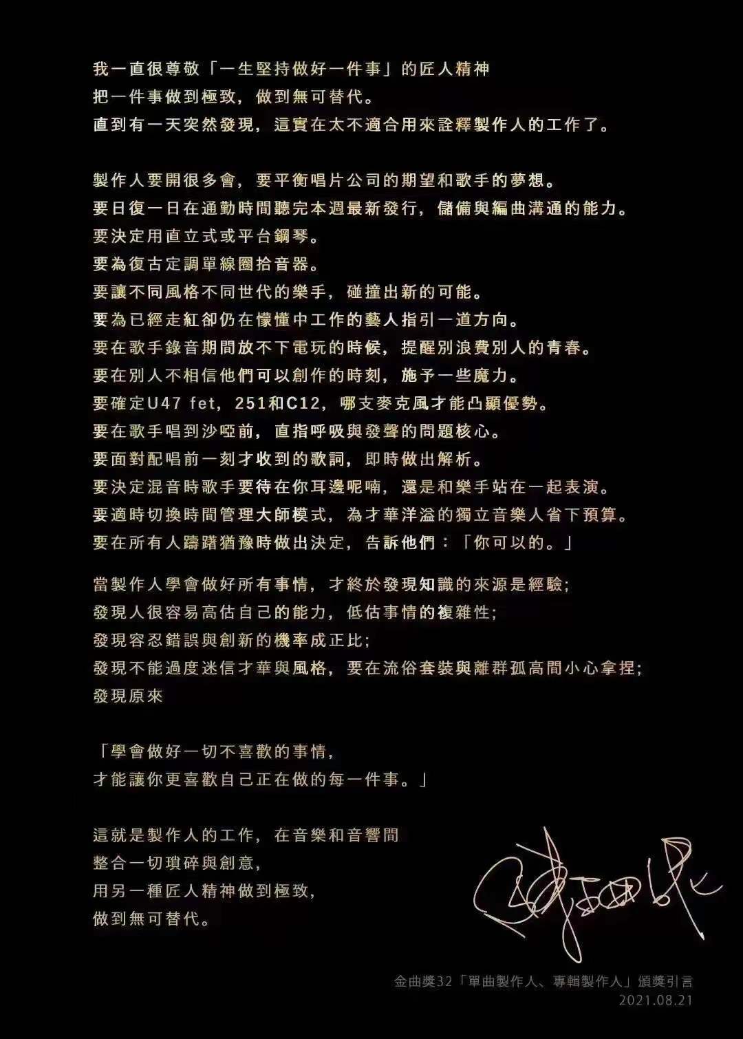 这几年我在金曲奖的引言,都只是依照典礼的需求,不浪费社会资源的前提,说一些我认为要紧的事。自己擅长什么就做什么,不需要刻意去仿效别人的形式或观点。因为我发现一般听众其实并不太清楚制作人的工作,既然金曲奖是一个鼓励音乐产业工作者的场合,理当用最简明的方式,让一般大众对于制作人的工作多一点了解。