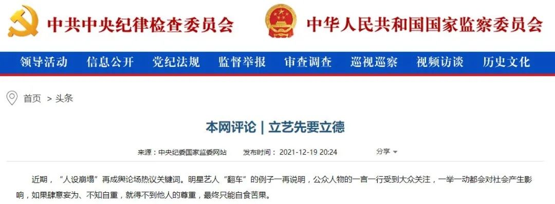 12月19日晚,中央纪委国家监委网站发布题为《本网评论 | 立艺先要立德》的文章。