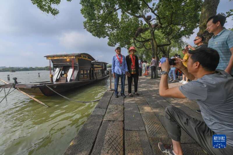 老党员在浙江嘉兴南湖湖心岛停泊的南湖红船旁留影(2021年7月1日摄)。新华社记者 徐昱 摄