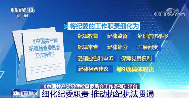 《条例》将纪委的工作职责细化为纪律教育、纪律监督、处理信访举报、纪律审查、纪律处分、开展问责、受理控告和申诉、保障党员权利、纪律检查建议等9项具体职责,丰富了监督检查的内容方式,细化了纪律审查的规定,完善了纪律处分的程序。