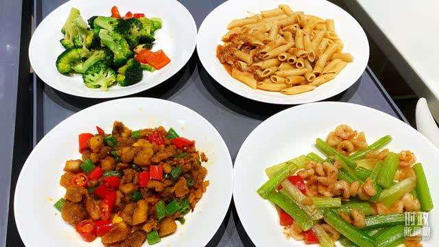 △当天机器人餐厅制作的辣子鸡丁、意面等四道美食。(总台央视记者张宇拍摄)