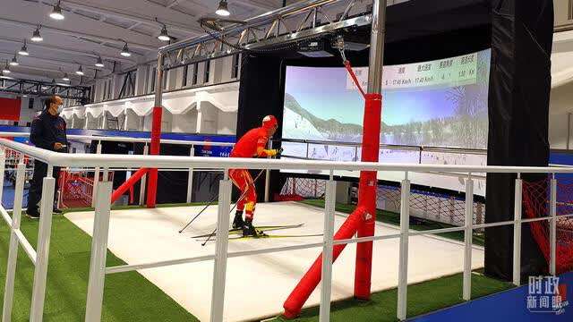 △六自由度一馆的多功能训练系统,适用滑雪专项训练。运动员采用真实雪板和雪杖在沉浸式VP环境中训练,脚下的雪毯能模拟出雪上滑行的摩擦力感。(总台央视记者杨立峰拍摄)