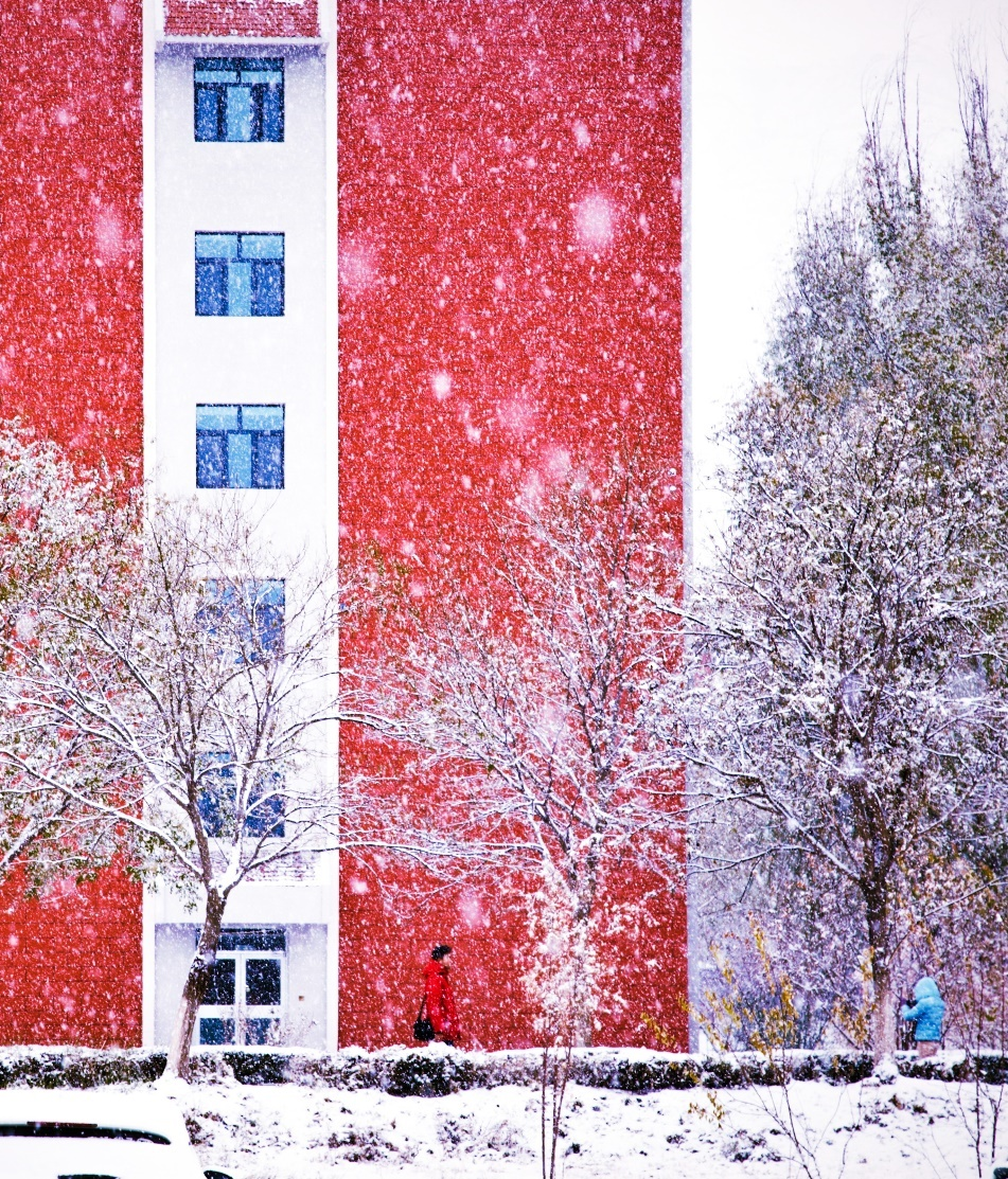 也会静下心来很用心体会每一个生活的瞬间,拍摄活动间隙发现的一处色彩光影很独特的窗口;军训行军路上恰巧拍到的一位温柔漂亮的辅导员姐姐;第一次在兰州看雪区拍了雪落红墙,在五一假期空荡荡的校园小径遇到一列挺拔的白杨,绿意鲜嫩;毓秀湖边的一丛小花恰好被阳光照到,长椅上的女生背后是秋意斑斓,泳池蓝色的水中有一条条“小鱼”自在游动……太多美好的瞬间就在那里,在校园的角角落落等你去发现和记录。