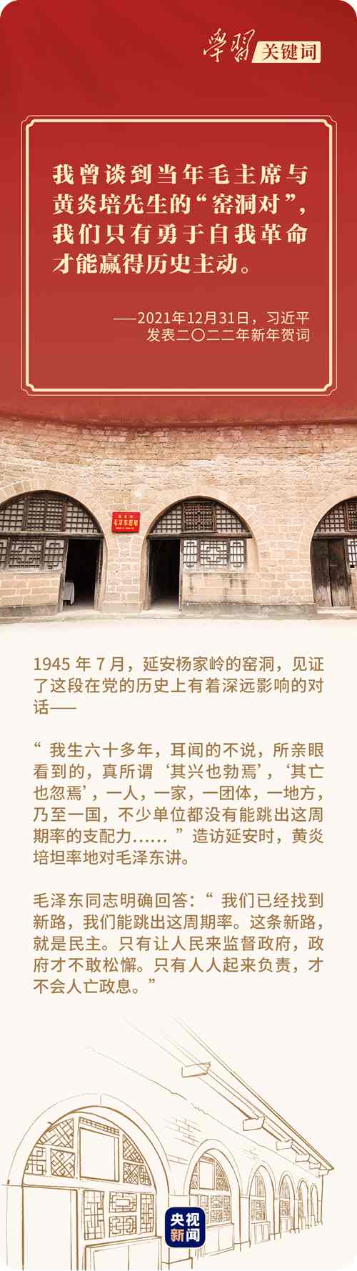 2021年11月11日,在党的十九届六中全会上,习近平总书记给出新解:“毛泽东同志在延安的窑洞里给出了第一个答案,这就是‘只有让人民来监督政府,政府才不敢松懈’。经过百年奋斗特别是党的十八大以来新的实践,我们党又给出了第二个答案,这就是自我革命。”