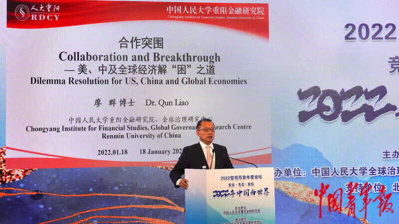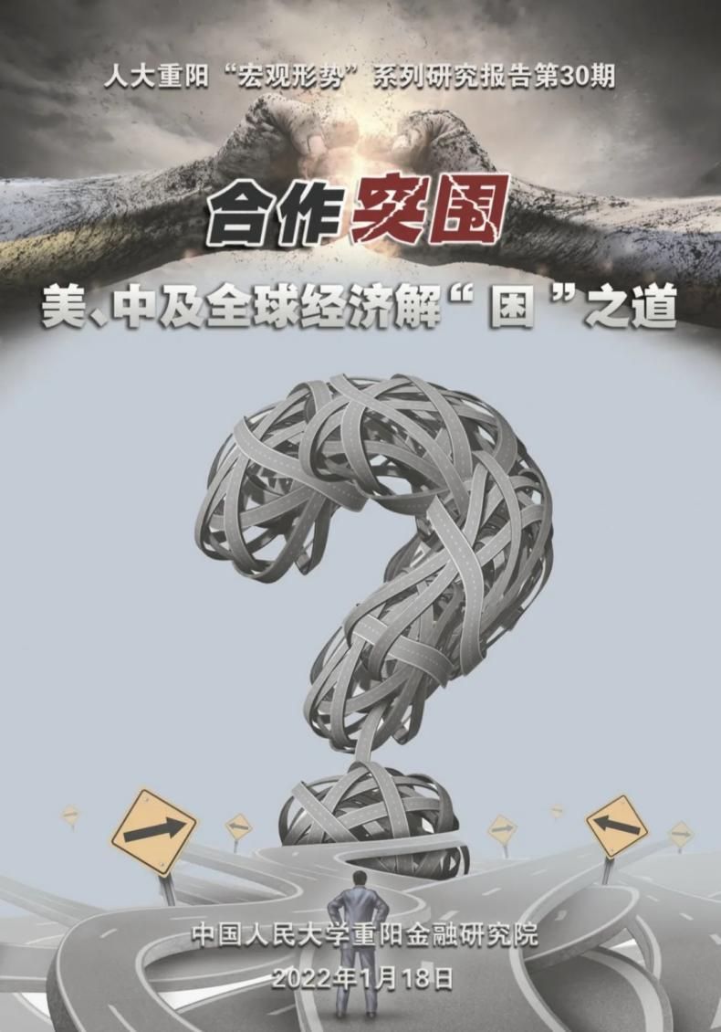 中国青年报客户端北京1月18日电(中青报·中青网记者 马子倩)今天,中国人民大学重阳金融研究院(人大重阳)在“竞合·先见·发现——2022年中国与世界”宏观形势年度论坛发布报告《合作突围:美、中及全球经济解“困”之道》(以下简称“报告”)。报告指出,当今全球经济、美国经济、中国经济均面临着不同的“困”局,只有中美两国合作,才可能实现“突围”。