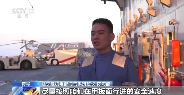 辽宁舰机电部门气供班班长 陈海超:尽量按照咱们在甲板行进的安全速度,也不能太快,尤其是咱们在进行推车作业的时候,一定要避开甲板调度的引导员还有一些危险区域,包括咱们歼-15的起落架,尾喷(口)、进气道这些部位,基本上都要按照指定的路线进行补给。