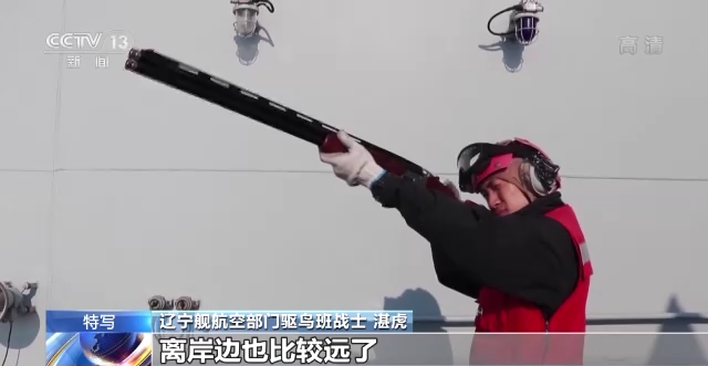 辽宁舰航空部门驱鸟班战士湛虎:在渤海海域离陆地比较近,那个地方鸟类活动比较频繁,平时可能鸟类可以达到上百只,现在深入远海大洋,离岸边也比较远了,所以能看到鸟类的活动明显减少。就算现在鸟类比较少,我们也不能放松警惕。