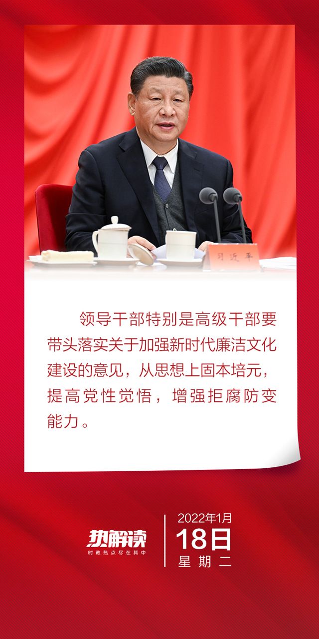 谈及保持反腐败政治定力,不断实现不敢腐、不能腐、不想腐这一战略目标时,总书记叮嘱:“领导干部特别是高级干部要带头落实关于加强新时代廉洁文化建设的意见,从思想上固本培元,提高党性觉悟,增强拒腐防变能力。”